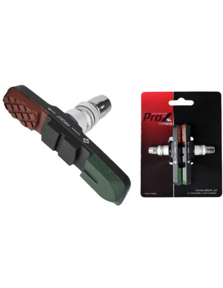 Klocki PROX M-960V do hamulców V-brake, wykonane z trzech mieszanek gumy, zielona - duża zdolność hamowania w wilgotnych warunkach, czarna - wysoka wydajność w każdych warunkach, brązowa - cicha praca. Długość klocka 72 mm, Waga: około 67 g.